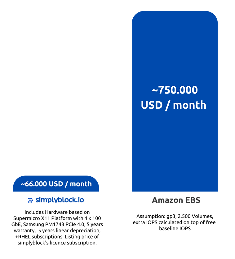 Simplyblock high-performance block storage solution for EC2 is a perfect complement or alternative to Amazon EBS. It provides significant cost savings for GB/month over AWS gp2, gp3, io1 and io2 volumes, much higher data durability, much higher maximum IOPS and practically no extra costs per IOPS provisioned.You can explore our AWS performance test results to see how Simplyblock compares in real-world benchmarks.