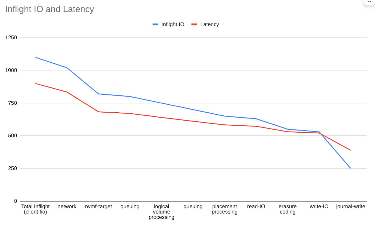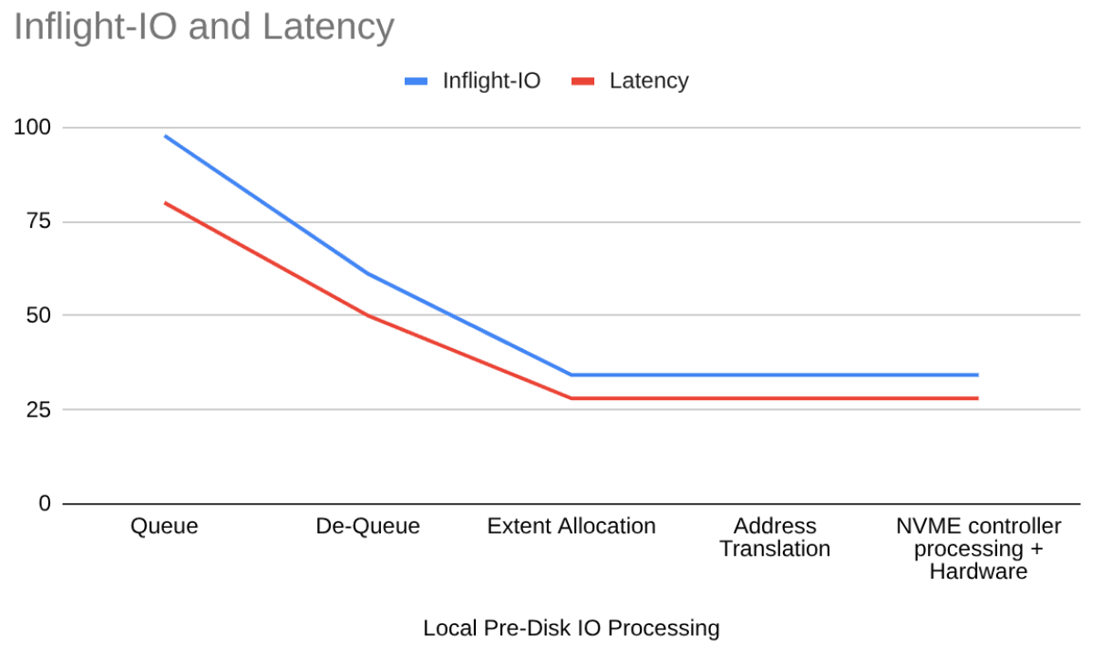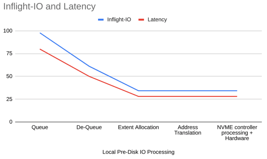 We can see that the number of in-flight I/O operations for a given section directly correlates with its latency. In other words, in-flight I/O accumulates where latency accumulates. The queue length shows each stage’s parallel capacity.