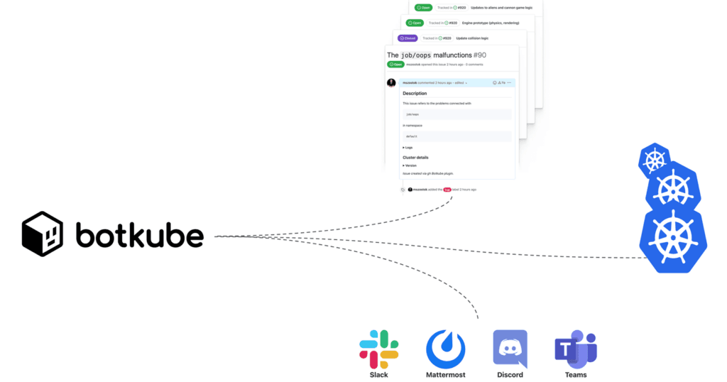 Operating a large Kubernetes landscape can be overwhelming. Getting early notifications or alerts in difficult situations is key. BotKube helps with the analysis of Kubernetes and Prometheus events, their correlation, and eventually with sending notifications into tools such as Microsoft Teams, Slack, or others. Learn more